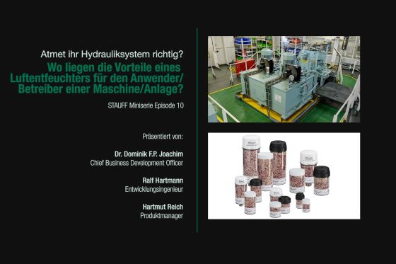Die Experten von STAUFF sehen Anwender, die Belüftungstrockner in hydraulischen Anlagen einsetzen, klar im Vorteil. Wer auf diese unscheinbare Komponente verzichtet, muss mit erhöhtem Wartungsaufwand rechnen und riskiert Schäden an seiner hydraulischen Anlage. Sehen Sie hier die Vorteile einer sachgemäßen Tankentfeuchtung: