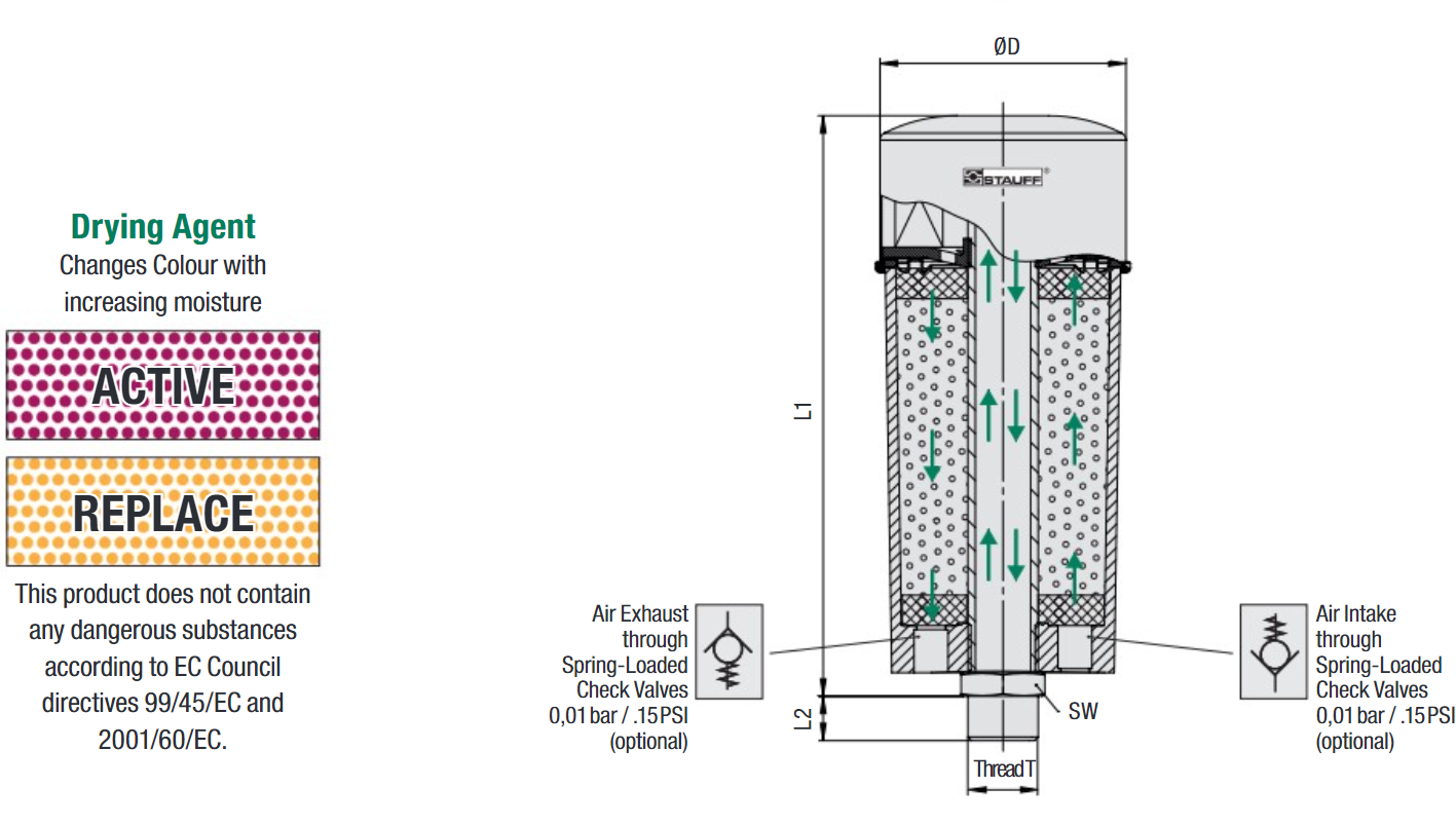 STAUFF offers a comprehensive selection of particle and desiccant breathers designed to protect hydraulic systems from contamination and moisture. Our range includes various sizes and versions of particle breathers, which can be combined with desiccant breathers, silica gel breathers, dehumidifiers, and air breather dryers. These products are essential STAUFF Hydraulic Accessories that ensure the longevity and efficiency of your hydraulic equipment by preventing the ingress of harmful particles and moisture. Explore our full catalog to find the perfect solution for your needs.